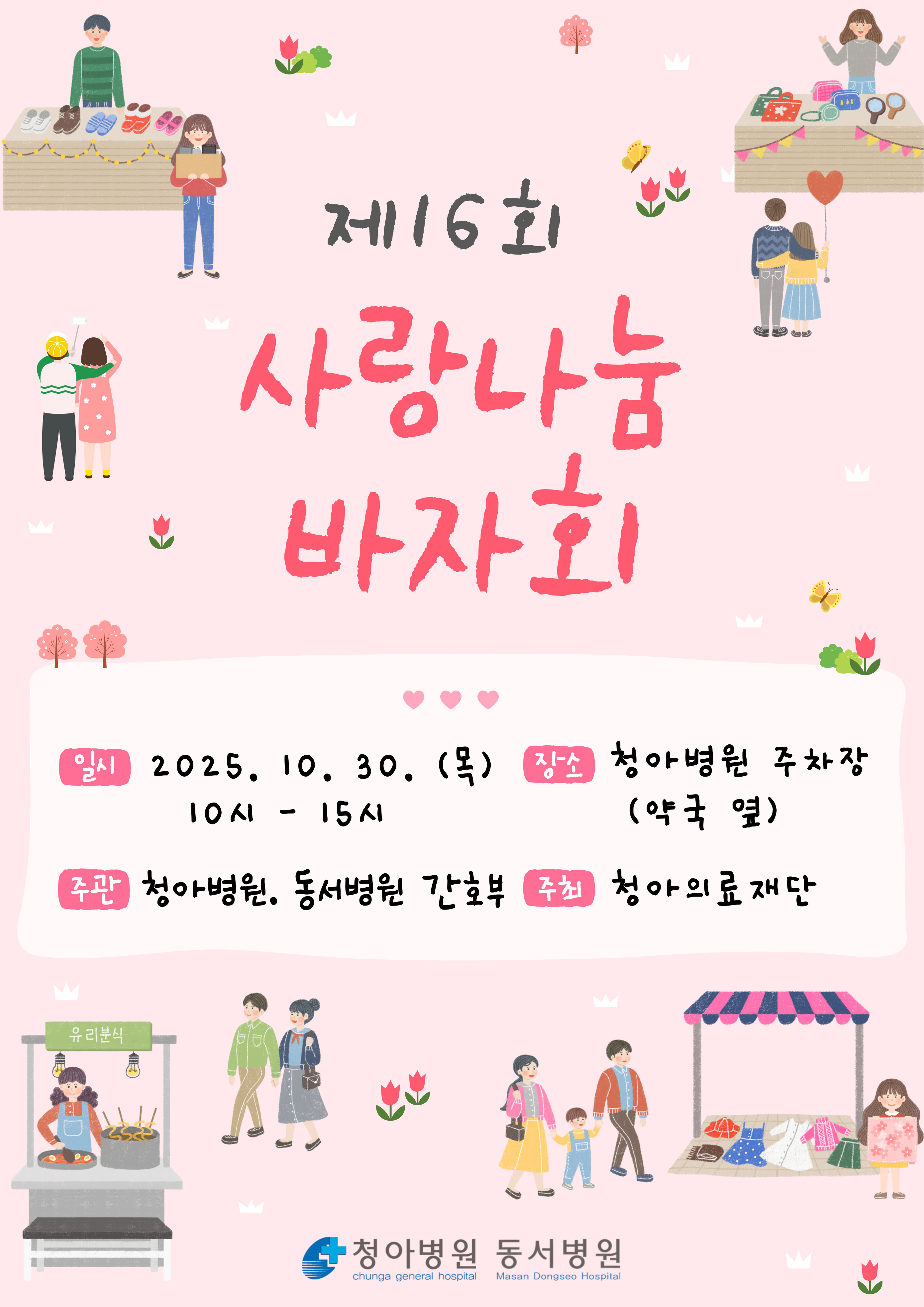 청아병원과 동서병원 간호부는 오는 10월 30일(목), 오전 10시부터 오후 3시까지 청아병원 주차장(성민약국 앞)에서 "이웃돕기 사랑나눔 바자회"를 개최합니다.