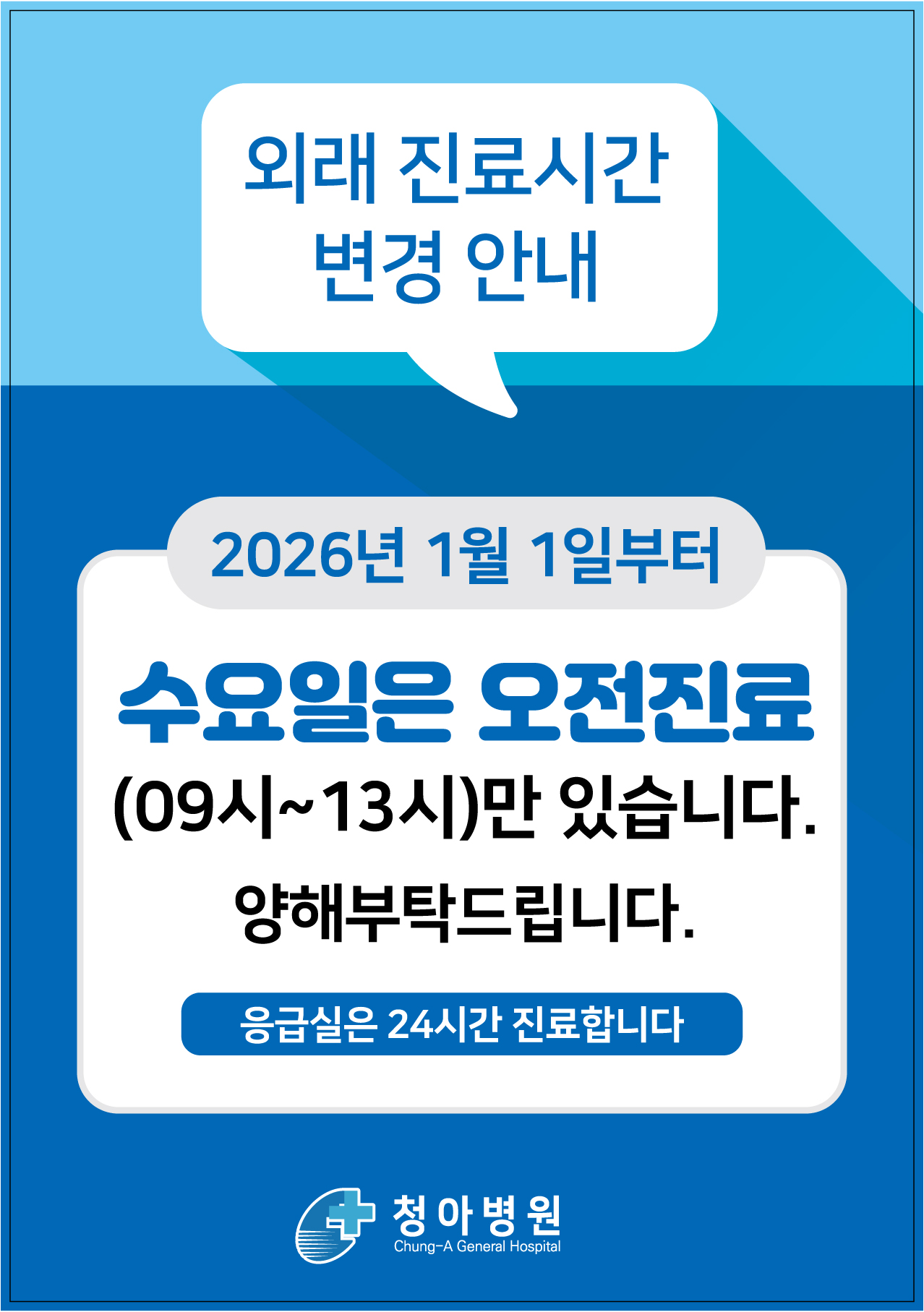 보다 효율적인 진료환경 조성을 위하여 2026년 1월 1일부터 수요일 외래 진료시간이 변경됨을 안내드립니다.