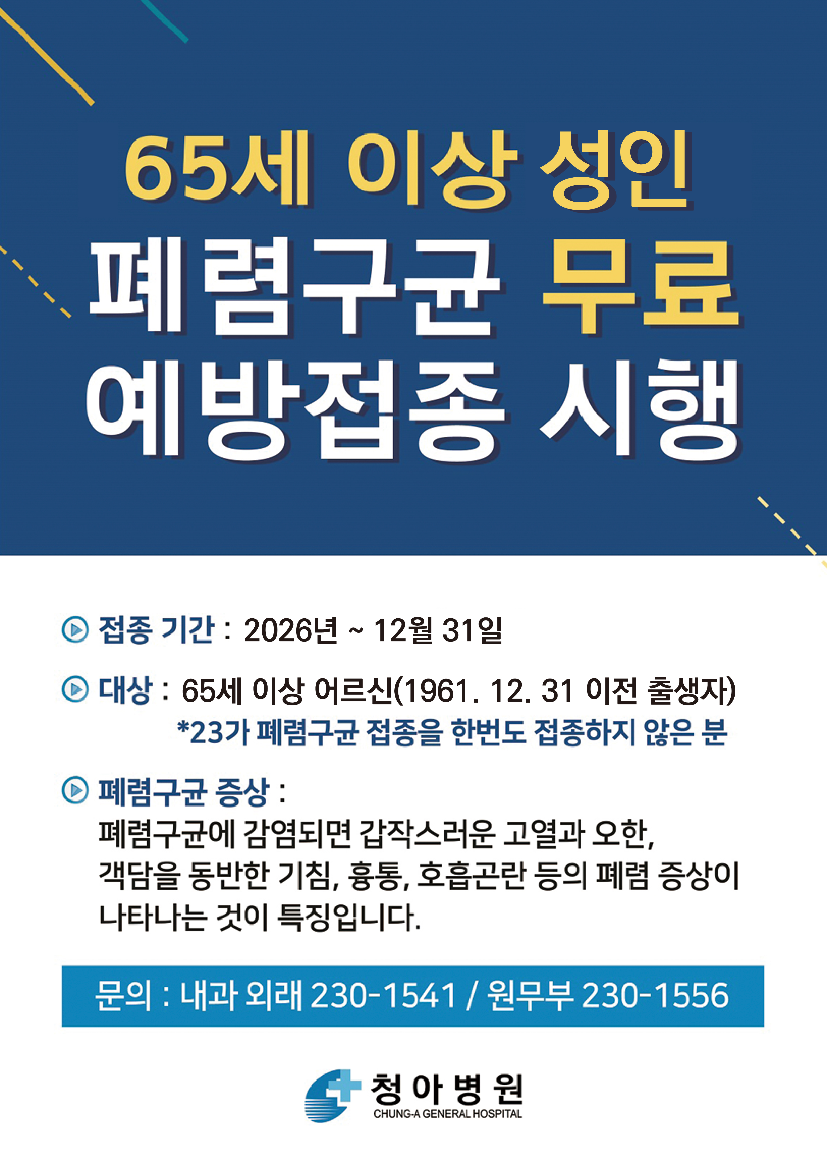 청아병원은 65세 이상 어르신들의 건강을 지키고 폐렴으로 인한 합병증을 예방하기 위해 폐렴구균 예방접종을 무료로 시행하고 있습니다.