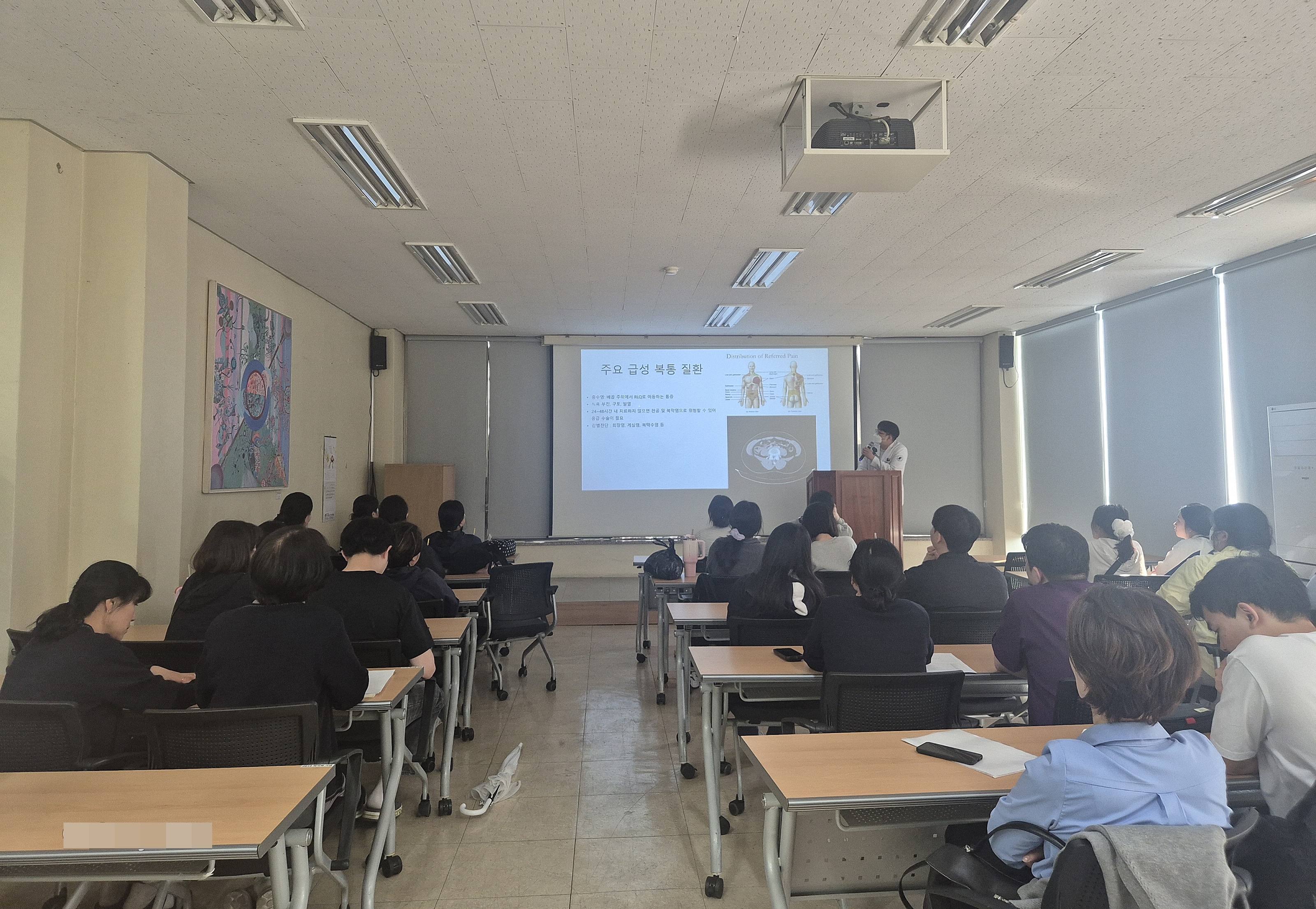특히 교육 내용에는 복통의 유형을 구분하는 기준과 함께 내장통과 체성통의 차이, 통증의 위치, 성질, 강도, 빈도 등을 포함한 병력 청취 방법, 그리고 동반 증상을 통한 진단 접근법 등이 포함됐다. 또한 급성 복통을 유발하는 주요 질환으로 급성 충수염, 담낭염, 게실염 등에 대한 임상적 특징과 주의사항을 상세히 다뤘다.
