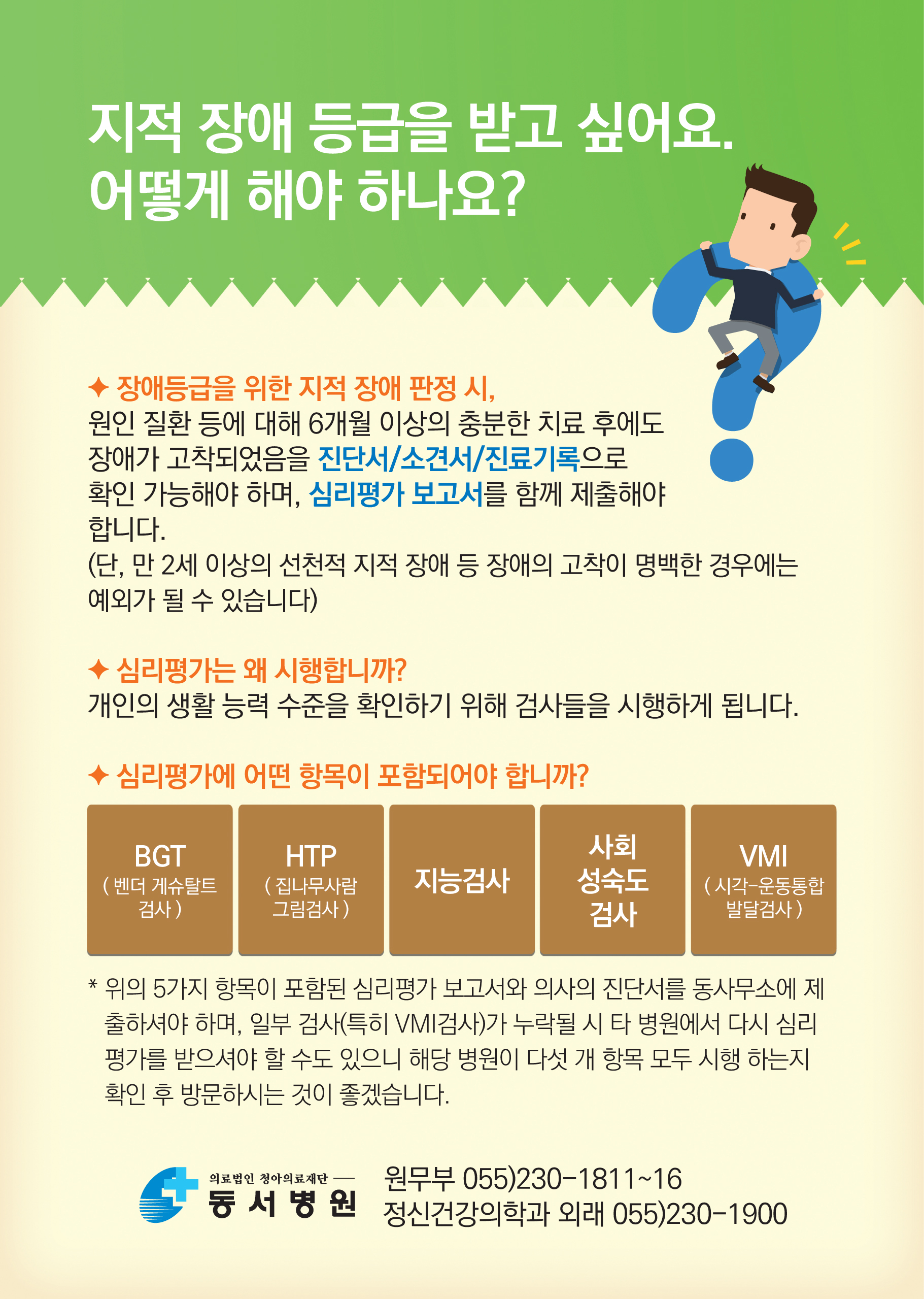 동서병원에서는 전문 의료진의 진단과 객관적인 검사를 통해 지적장애 판정 및 등급 신청에 필요한 절차를 안내해드리고 있습니다.